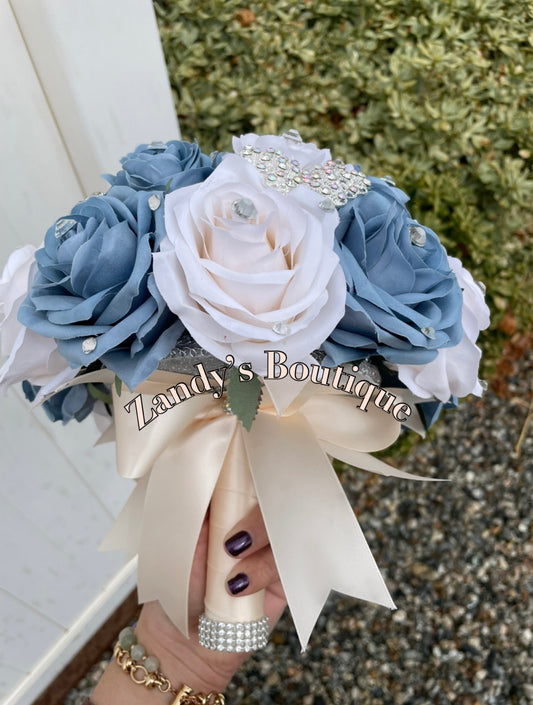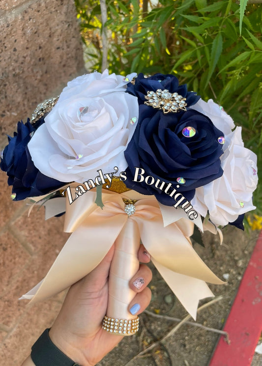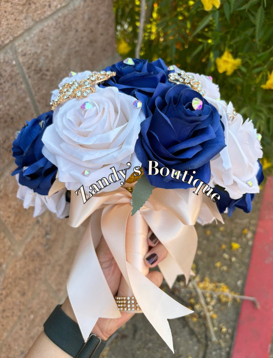 Cream and Royal Blue with Gold Butterfly Brooches Bouquet. CRRB029 by MARINA’S CRAFT.