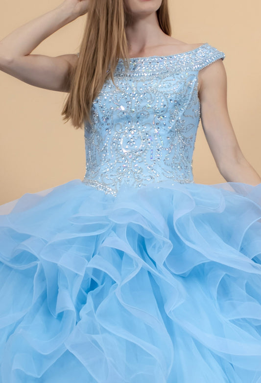 Jewel Glitter Quinceanera Gown w/ Long Mesh Layer and Ribbons. GL3175 GLS by Elizabeth K