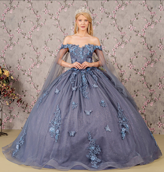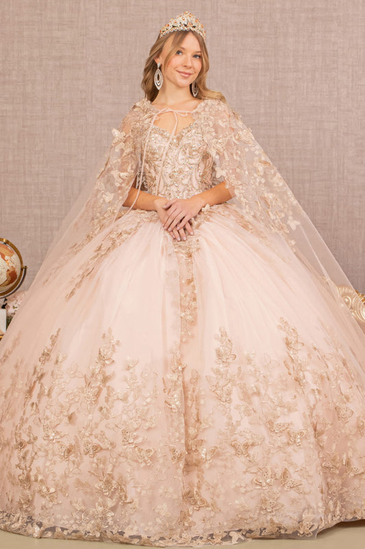 Jewel Mesh Quinceanera Gown w/ 3-D Butterfly Appliques and Long Mesh Cape. GL3104 GLS by Elizabeth K