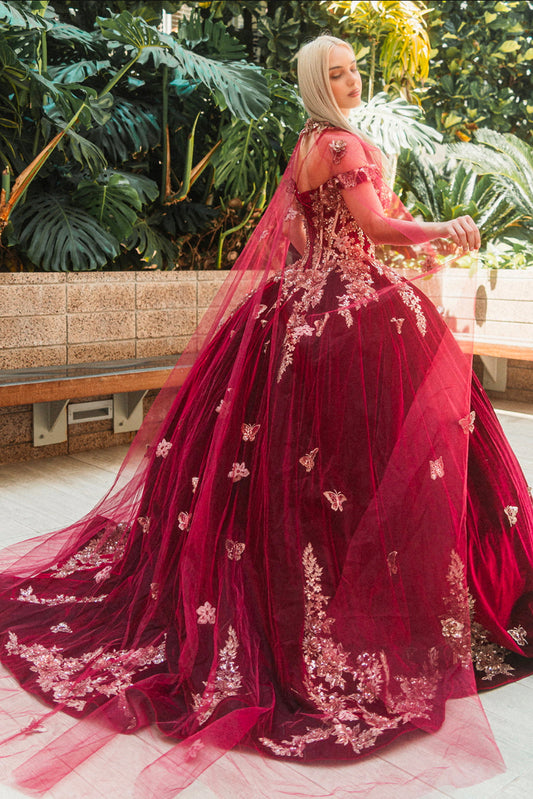 Metallic Embroidery Jewel Velvet Ball Gown w/ Long Mesh Cape. Gl3471 GLS by Gloria