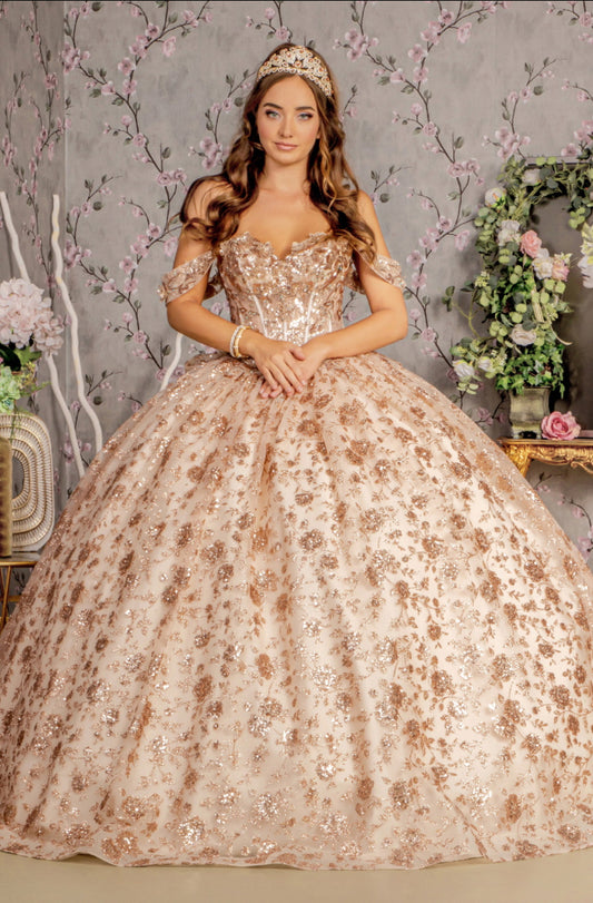 Metallic 3-D Flower Off Shoulder Mesh Ball Gown w/ Ruffled Back. GL3485 GLS By Gloria