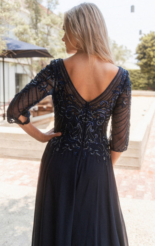 Metallic Embroidery Mesh Trumpet Long Dress w/ Side Slit GL3382 GLS BY GLORIA