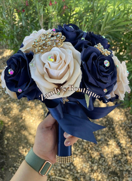 Navy and Champagne with Gold Brooches Bouquet. NYCH018 by MARINA’S CRAFT.