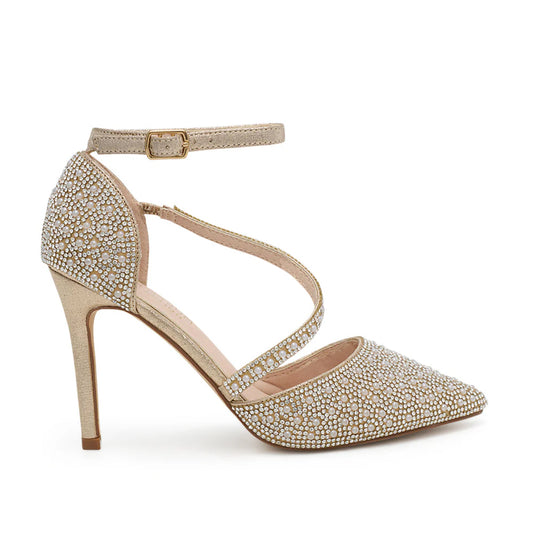 Nude 3.5" ankle strap pointed toe Heel. Rhinestone and Pearl. REESE-5 BY DE BLOSSOM