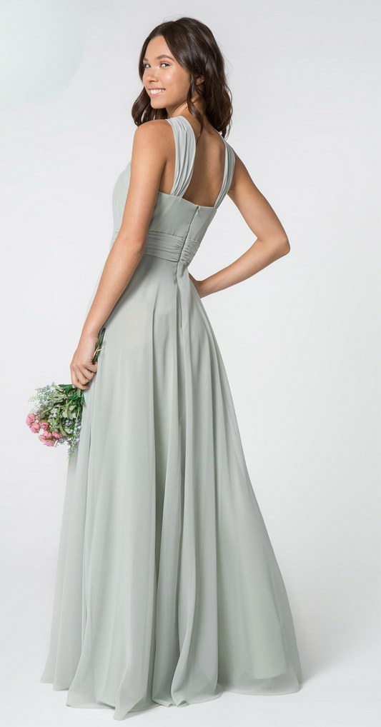 High-Neck Chiffon Ruched-Bodice. The bodice is fitted until it hits waist and flares out gracefully to the floor. GL2816 GLS BY Elizabeth K