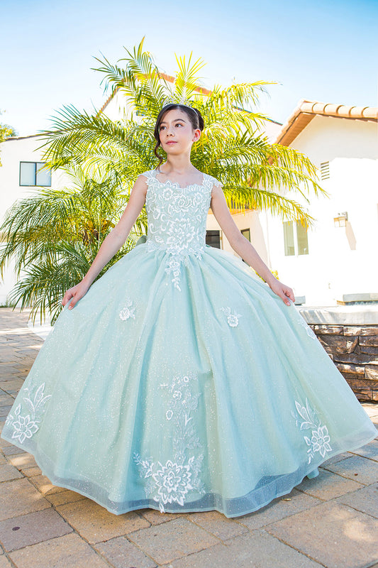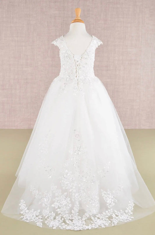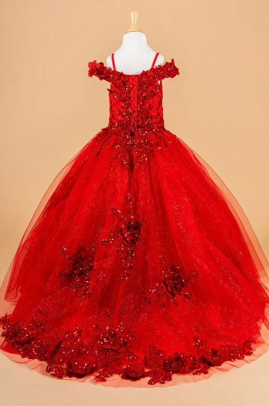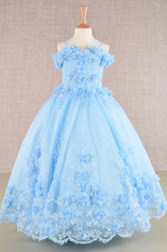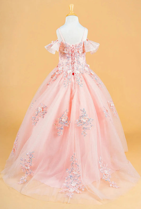 3D Flower Applique Sequins Embroidery Lace-Up Back Corset V-Neck Cold Shoulder Kids Dress. GL120 GLS BY ELIZABETH K