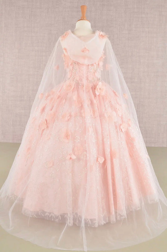 3D Flower Applique Jewel Mesh Kids Dress with Long Mesh Cloak Available in Baby Blue, Blush, Lilac and Red. GK105 BY ELIZABETH K