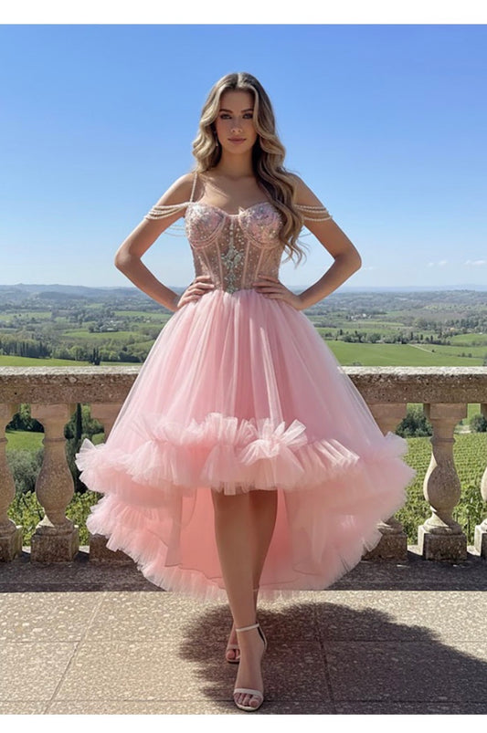 Sweetheart neckline, 3D floral appliqués, and a full tulle skirt with a ruffled. PQ1106 BY BELLA COUTURE