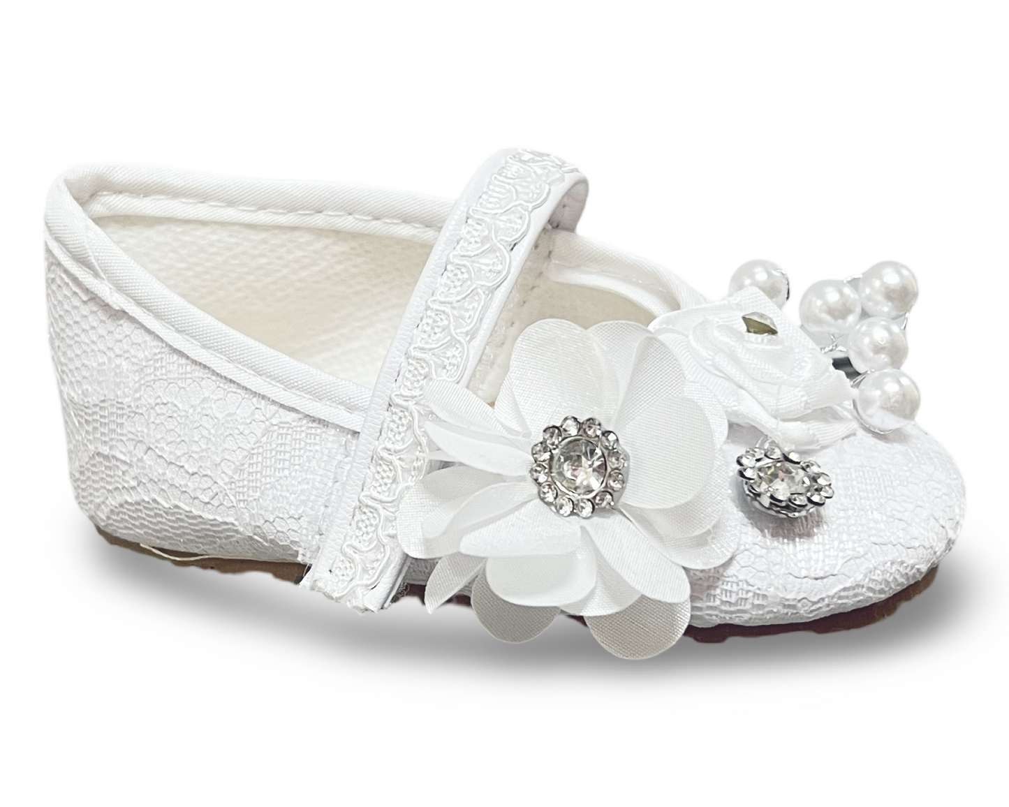 A beautiful lacey shoe that is comfortable for your princess! 3-D Flowers with pearls and gems along with rubber soft soles. Completed with a Velcro, strap to secure to shoe!
